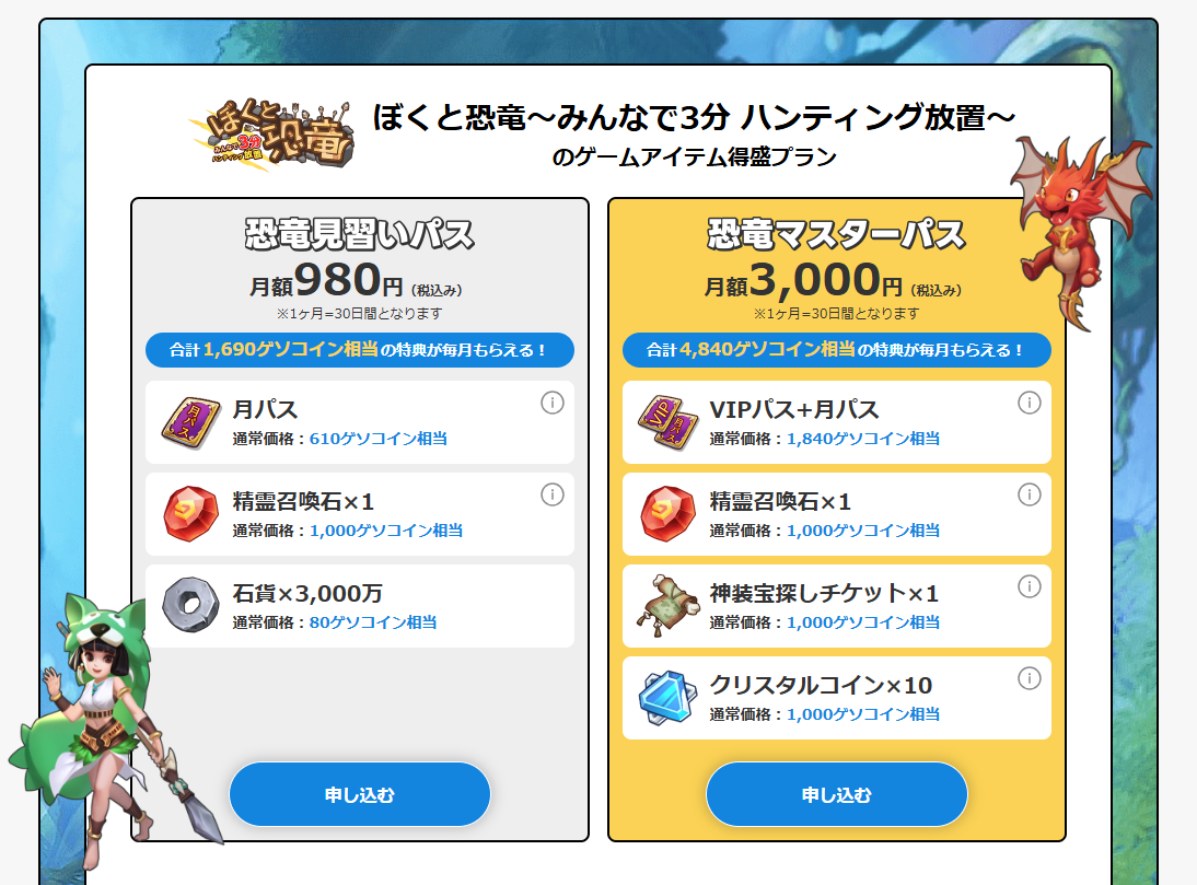 ゲームアイテム得盛プランとはなんですか? 「ゲームアイテム得盛プラン」とは、月額980円からご利用できる月額制(サブスクリプション)サービスです。このプランに加入すると、毎月お支払い額以上のゲーム内アイテムを受け取ることができます。